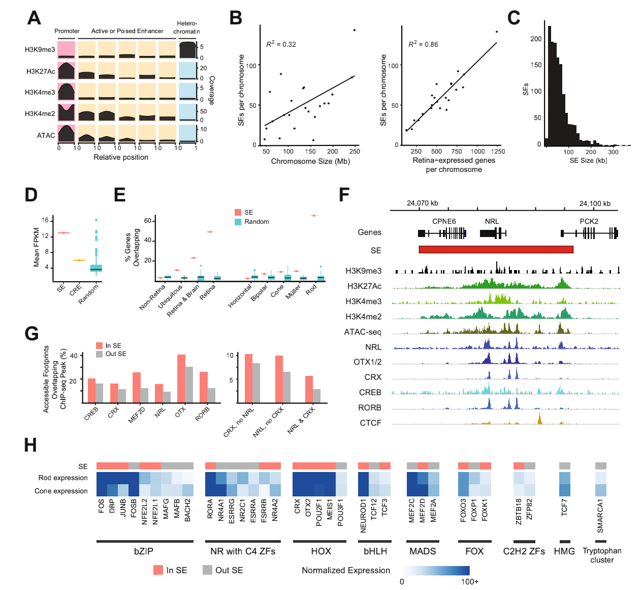 利用H3K27Ac蛋白標(biāo)記互作在視網(wǎng)膜順式調(diào)控元件啟動(dòng)子和活性或穩(wěn)定增強(qiáng)子區(qū)域鑒定了1325個(gè)超級(jí)增強(qiáng)子(SEs),發(fā)現(xiàn)視網(wǎng)膜表達(dá)基因的數(shù)量與每個(gè)染色體的SE數(shù)量之間存在高度相關(guān)性。SE與轉(zhuǎn)錄組測(cè)序數(shù)據(jù)集結(jié)合分析表明,與CRE相比,SE重疊的基因的平均表達(dá)量高2.17倍,并且比100組隨機(jī)SE大小的位點(diǎn)高2.89倍,視網(wǎng)膜中關(guān)鍵的光感受器特異性基因NRL主要在活性組蛋白標(biāo)記和染色質(zhì)開(kāi)放區(qū)域的大型SE中富集,與CRE或隨機(jī)區(qū)域相比,TF結(jié)合位點(diǎn)主要存在于SE中,其中編碼許多具有豐富結(jié)合基序TF的基因也與SE重疊,這表明它們?cè)诰S持視網(wǎng)膜穩(wěn)態(tài)方面的潛在作用。