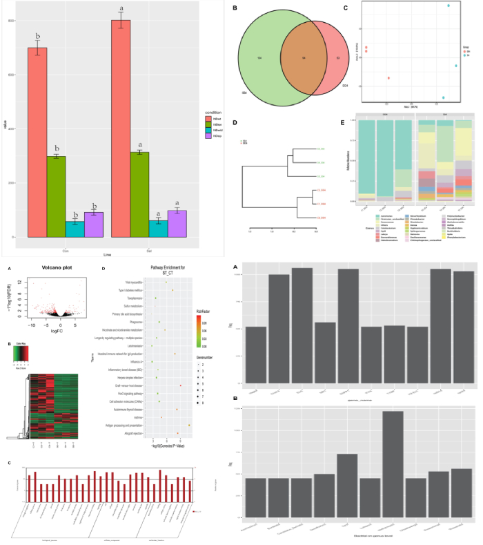 實(shí)驗(yàn)組和對(duì)照組之間的差異基因表達(dá):使用與16S測(cè)序相同的樣本對(duì)黃河鯉新品種(實(shí)驗(yàn)組)和對(duì)照組中的轉(zhuǎn)錄組進(jìn)行測(cè)序并鑒定差異基因(DEG)。在249個(gè)顯著DEGs中,194個(gè)基因表達(dá)下調(diào),55個(gè)基因表達(dá)上調(diào)。通過(guò)GO注釋?zhuān)@些基因被分為以下功能類(lèi)別:生物調(diào)節(jié)、細(xì)胞過(guò)程、解毒作用、發(fā)育過(guò)程、免疫系統(tǒng)進(jìn)程等(都屬于生物過(guò)程);細(xì)胞、細(xì)胞部分、胞外區(qū)域、胞外區(qū)域部分、大分子復(fù)合物等(細(xì)胞成分);抗氧化活性、結(jié)合活性、催化活性、分子功能調(diào)節(jié)器上等(分子功能)。聚類(lèi)分析表明,實(shí)驗(yàn)組和對(duì)照組具有不同的特征,DEG分為四個(gè)部分,大部分基因注釋到了免疫相關(guān)途徑。