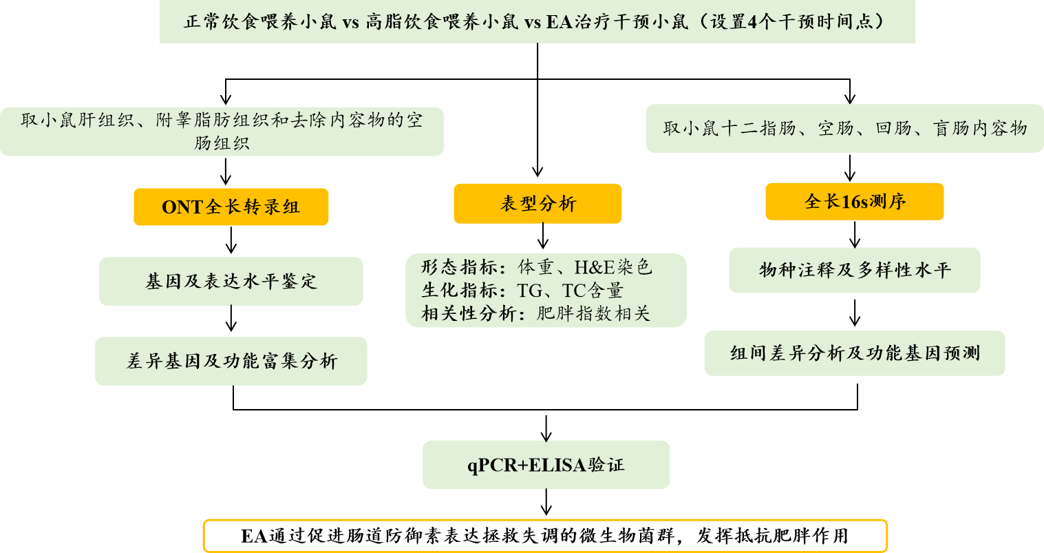 肥胖作為一種不斷增長(zhǎng)的非傳染性流行病,影響了超過20億人。腸道微生物菌群失調(diào)已被證明是肥胖和肥胖相關(guān)疾病發(fā)生和進(jìn)展的關(guān)鍵因素,包括高血壓、II型糖尿病、血脂異常和非酒精性脂肪性肝?。∟AFLD)。針灸已被廣泛用于治療肥胖癥,研究報(bào)道,電針(EA)可以減輕肥胖小鼠的體重,挽救生態(tài)失調(diào)的腸道微生物群,還可以調(diào)節(jié)免疫力。然而,EAEA重塑腸道微生物群的潛在機(jī)制尚不清楚,如何通過腸道微生物菌群調(diào)節(jié)腸道先天免疫力對(duì)抗肥胖仍有待闡明。