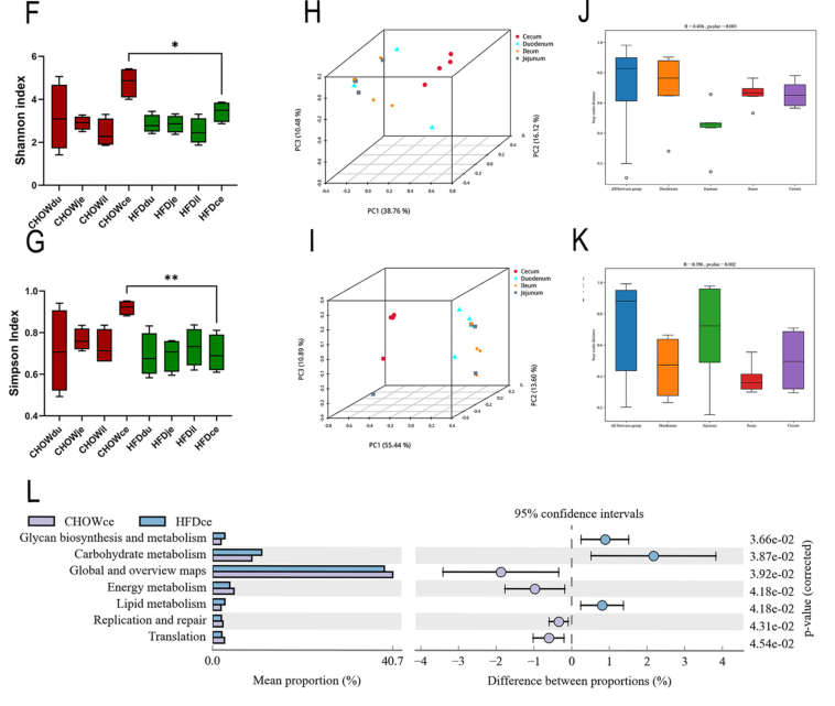 α多樣性分析結(jié)果顯示,高脂飲食HFD組與正常對(duì)照組的十二指腸、空腸和回腸微生物多樣性沒有顯著差異,但在盲腸中HFD組微生物多樣性顯著減少(圖1F, 1G);β多樣性分析結(jié)果顯示,與其他腸道段相比,只有盲腸微生物菌群在HFD組與正常對(duì)照組表現(xiàn)出顯著差異(圖1H, 1I);此外,top 15的KEGG通路中有7個(gè)是基于微生物功能富集,高脂飲食組盲腸微生物的上調(diào)通路包括脂質(zhì)代謝、碳水化合物代謝和聚糖生物合成和代謝,下調(diào)通路包括能量代謝相關(guān)途徑(圖1L)。