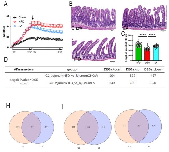 相較于HFD組,EA組顯示出顯著地減肥效果(圖2A),并減少了附睪、腎臟和腹股溝區(qū)域的脂肪堆積。空腸是腸道脂質(zhì)消化和吸收的主要區(qū)域,HFD小鼠的空腸絨毛明顯長(zhǎng)于食物組(圖2B, 2C)。HFD組和正常對(duì)照組間共鑒定出994個(gè)差異表達(dá)基因DEG(圖2D-F),HFD組和EA組共鑒定出849個(gè)DEG(圖2G);通過取兩個(gè)比較組共有的DEG,作為EA直接調(diào)控肥胖的DEG,共檢測(cè)到共有基因299個(gè),其中上調(diào)的有165個(gè),下調(diào)的有133個(gè)(圖2H-J)。