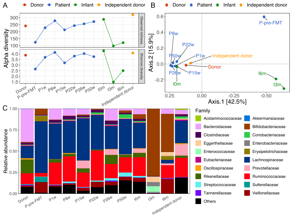 該研究通過對(duì)糞便捐獻(xiàn)者、孕婦和嬰兒的糞便樣本進(jìn)行宏基因組測(cè)序和菌株水平分析,并進(jìn)一步與收集的651名健康嬰兒和58名健康成年人的宏基因組樣本進(jìn)行比較,發(fā)現(xiàn)一些特定的菌株從捐贈(zèng)者轉(zhuǎn)移到患者身上,然后轉(zhuǎn)移到嬰兒,證明了跨代微生物轉(zhuǎn)移。