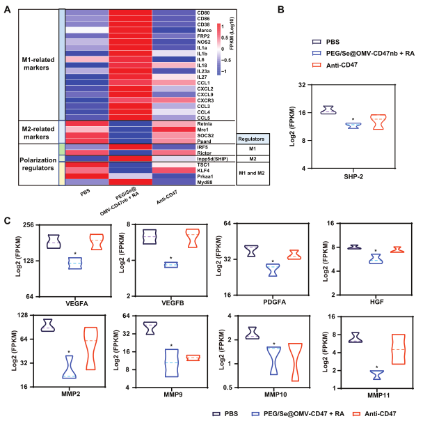 利用FACS分選出PBS、PGE/Se@OMV-CD47nb+RA和anti-CD47處理的皮下成瘤小鼠的瘤內(nèi)巨噬細胞,進行RNA-seq。分析結果顯示,與PBS組相比,PGE/Se@OMV-CD47nb+RA組M1型巨噬細胞maker基因表達水平上調(diào),包括:CD80、CD86、CD38、Marco、FPR2、NOS2、IL-1α、IL-1β、IL-6、IL-18、IL-23a、IL-27、CCL1、CXCL2、CXCL9、、CXCR3、CCL3、CCL4和CCL5,M2型相關的marker基因表達水平下調(diào),包括:Rentla、Mrc1、SOCS2和Ppard,提示與M1型相關趨化因子的表達增加可能是招募免疫細胞進入TEM的原因;PGE/Se@OMV-CD47nb+RA組中M1型極化相關的轉錄因子IRF-5和Myd88表達水平上調(diào),M2型極化相關的轉錄因子Rictor、TSC1、Klf4和Prkaa1表達水平下調(diào)(圖3A); 相較PBS組,PGE/Se@OMV-CD47nb+RA和anti-CD47組中CD47-SIRPα信號通路下游分子SHP2表達水平下調(diào),可能與CD47的阻斷作用有關(圖3B)。