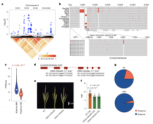 隨后,作者使用RNA-seq數(shù)據(jù)進一步研究了不同pan-gene的表達譜??傮w表達豐度情況從核心、軟核心到可變基因逐漸降低,表明核心基因具有穩(wěn)定和更廣泛的表達譜,而可變基因具有較低水平、組織特異性、品系特異性或條件依賴性表達。核心基因編碼區(qū)中非同義變與總突變的比率低于軟核心和可變基因(圖2f)??梢宰⑨尩幕虮壤龔暮诵?、軟核心到可變基因逐漸減少(圖2g)。以上結(jié)果表明,核心基因在進化上更加保守。