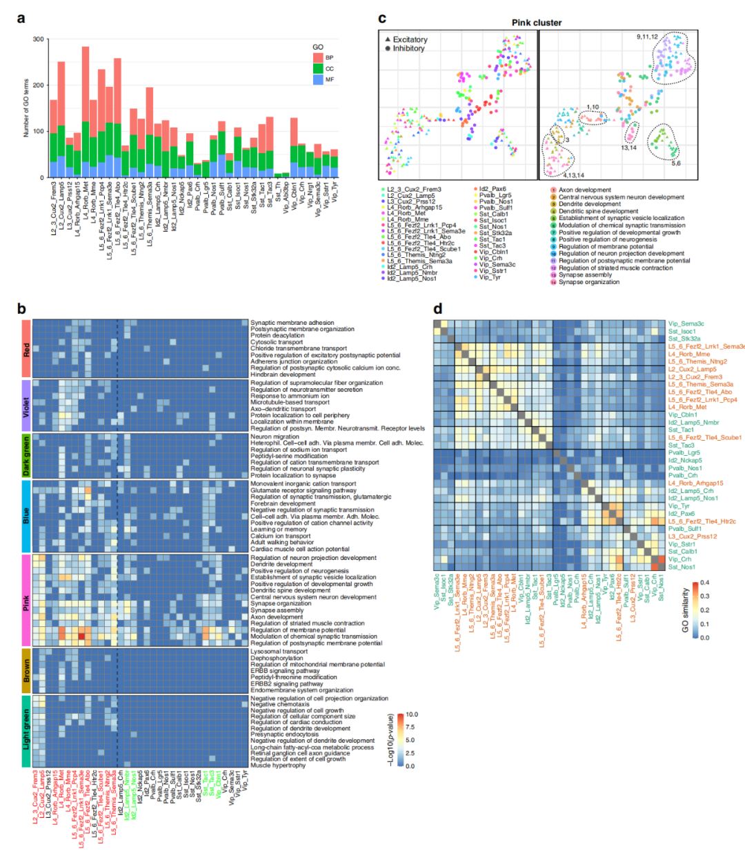 作者計算了每種已鑒定亞型GO中DE基因的富集程度,一些神經(jīng)元亞型在癲癇中表現(xiàn)出了大的轉(zhuǎn)錄組改變(>100豐富的GO),但多數(shù)神經(jīng)元亞型中只有少數(shù)GO,特別是對于生物過程(BP)來說,這應(yīng)該與通路的生物學功能相關(guān)(圖2a)。這些受影響較小的亞型中,大多數(shù)在癲癇細胞和非癲癇細胞之間也具有高的基因表達相關(guān)性(圖1d),從而證實癲癇和非癲癇之間轉(zhuǎn)錄組相關(guān)性高的亞型中,癲癇改變的信號通路也較少。