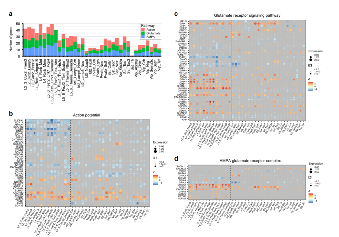 谷氨酸受體,尤其是AMPA受體被證明是癲癇發(fā)作的主要驅(qū)動力之一,在篩選出缺乏表達的基因后,尋找富含與奮性相關(guān)轉(zhuǎn)錄組學變化的亞型,并從這些GO項中繪制DE基因(圖3a–d)。CKAMP44是貫穿整個顳葉皮質(zhì)的主要AMPA受體輔助亞基,這一事實也強調(diào)了CKAMP44上調(diào)的重要性(圖3c, d)。癲癇對AMPA受體輔助亞基編碼基因的上調(diào)有相當普遍的影響。