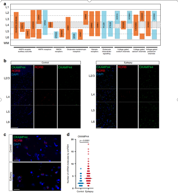 癲癇患者皮層谷氨酸介導興奮相關(guān)基因顯著分層上調(diào)或下調(diào)。作者用單分子熒光原位雜交(smFISH)方法標記了幾個高度調(diào)控基因的mRNA。如上所述,在主要神經(jīng)元的亞型中,編碼AMPA輔助亞基的許多基因分層上調(diào)。因此,在一組癲癇和非癲癇樣本的皮質(zhì)切片中標記了CKAMP44 mRNA,通過與Rorb和DAPI共標記,并確定了L2/3、L4和L5/6的位置(圖4b)。重要的是,證實了各層中CKAMP44的表達顯著上調(diào)(圖4b)。
