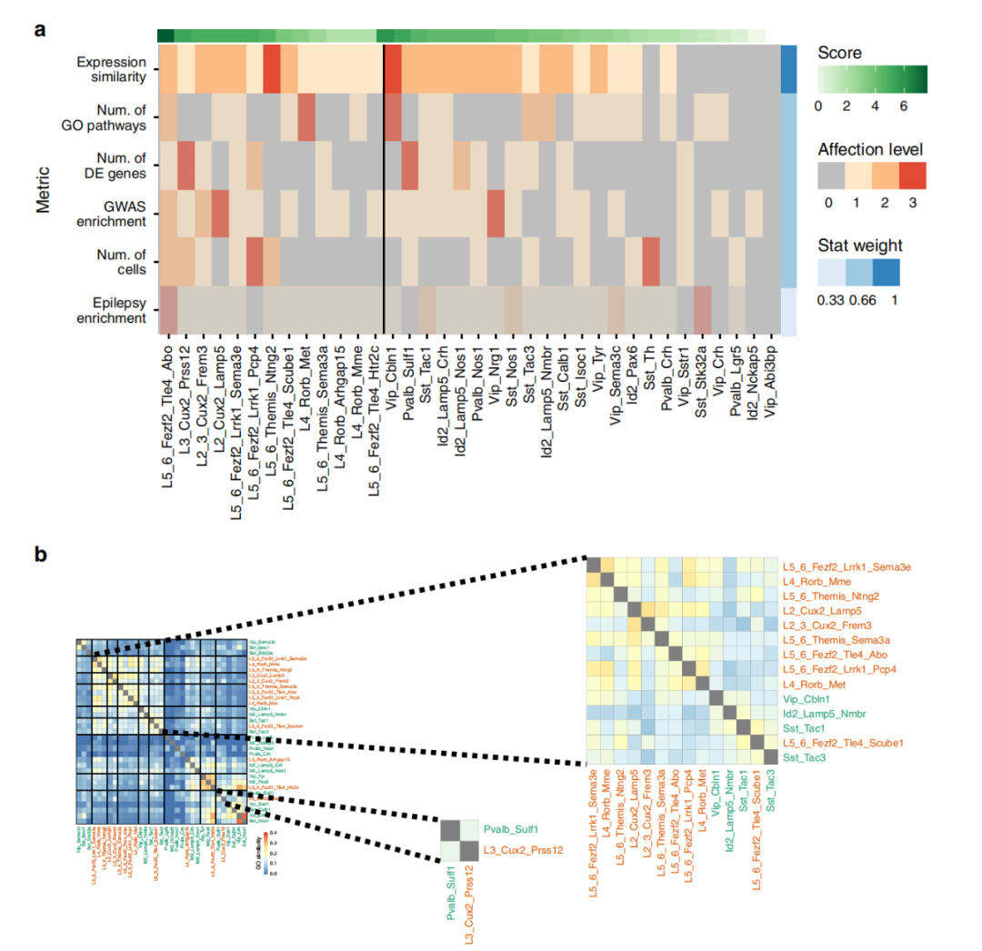 在癲癇樣本中,六個與癲癇密切相關(guān)的模塊上調(diào),六個下調(diào)。另外,在細胞水平分析中突出的幾個涉及過度興奮信號和癲癇發(fā)作的基因也是一個或多個癲癇相關(guān)基因模塊的成員。編碼谷氨酸受體亞基的基因也廣泛存在于癲癇相關(guān)模塊中。這些基因共表達分析捕獲了主要神經(jīng)元L5-6_Fezf2_Tle4_Abo和L2-3_Cux2亞型中活躍的核心轉(zhuǎn)錄網(wǎng)絡(luò)。與癲癇狀態(tài)相關(guān)的基因模塊指向與突觸和離子通道相關(guān)的轉(zhuǎn)錄變化,包括AMPA受體輔助亞基、谷氨酸受體亞基和電壓門控鈉通道,這些可能與癲癇回路異常高的興奮有關(guān)。同時觀察到主要神經(jīng)元和GABAergic間神經(jīng)元的受影響的亞型根據(jù)豐富的GO項的相似性聚集在一起(圖5b)。因此,L2-3_Cux2和L5-6_Fezf2亞型與Sst_Tac1和Vip_Cbln1亞型共聚,而L3_Cux2_Prss12亞型與Pvalb_Sulf1亞型共聚,這可能是癲癇轉(zhuǎn)錄組中受影響嚴重的局部神經(jīng)網(wǎng)絡(luò)的基礎(chǔ)。