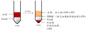 外周血單核細(xì)胞(Peripheral blood monoculear cell, PBMC)中大部分都是淋巴細(xì)胞(包括B細(xì)胞和T細(xì)胞),以及少部分的自然殺傷細(xì)胞和單核細(xì)胞,而紅細(xì)胞和血小板沒有細(xì)胞核,而粒細(xì)胞(granulocytes) 包括中性粒細(xì)胞、嗜堿性粒細(xì)胞和嗜酸性粒細(xì)胞,有多葉核,所以不包括在PBMC中。PBMC的制備采用密度梯度離心法,可通過Ficoll作為密度梯度介,使得不同密度的細(xì)胞在對(duì)應(yīng)的界面處,然后通過快速離心,實(shí)現(xiàn)細(xì)胞分離。