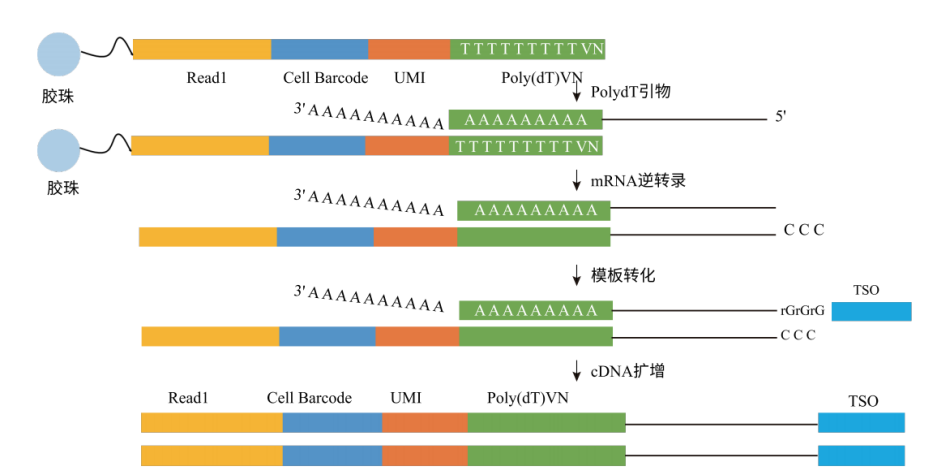 GEMs形成后,細(xì)胞裂解釋放出mRNA;同時(shí)膠珠也會(huì)自動(dòng)溶解,釋放出大量含有Barcode序列的引物,并利用引物末端的Ploy(dT)VN序列捕獲液滴中的mRNA,并在一個(gè)個(gè)GEM中獨(dú)立完成mRNA逆轉(zhuǎn)錄,產(chǎn)生帶有Barcode和UMI信息的cDNA。隨后“油包水”結(jié)構(gòu)裂開,進(jìn)行cDNA擴(kuò)增。