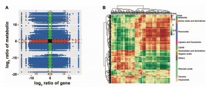 最后,為了進(jìn)一步準(zhǔn)確了解成熟果實(shí)中轉(zhuǎn)錄水平與代謝物變化之間的關(guān)系,作者進(jìn)行了DEGs與DAMs之間的相關(guān)分析,其中,變化趨勢(shì)相同的DEGs和DAMs主要涉及類黃酮、酚酸類、氨基酸及其衍生物、萜類、有機(jī)酸、脂類等(圖7)。