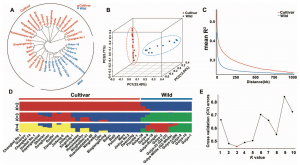 對(duì)26個(gè)典型的枇杷栽培種質(zhì)資源(代表全球不同地區(qū)的栽培種質(zhì)資源)和11個(gè)來自中國(guó)西南地區(qū)的野生種質(zhì)資源進(jìn)行了全基因組重測(cè)序,平均深度為22.49×,共鑒定出10,978,138個(gè)高質(zhì)量的SNP。系統(tǒng)發(fā)育和主成分(PCA)分析表明,野生種質(zhì)和栽培種質(zhì)聚為兩個(gè)不同的組(圖3A和B)。野生枇杷的核苷酸多樣性(π)(2.28×10?3)高于栽培枇杷(1.44×10?3),LD衰減速度快于栽培枇杷(圖3C),期望雜合度和觀測(cè)雜合度的平均值均顯著高于栽培枇杷。進(jìn)一步利用Structure對(duì)種群結(jié)構(gòu)分析顯示,當(dāng)K=2時(shí),所有個(gè)體被清楚地細(xì)分為野生和栽培種質(zhì)的兩個(gè)特定分支(圖3D)。