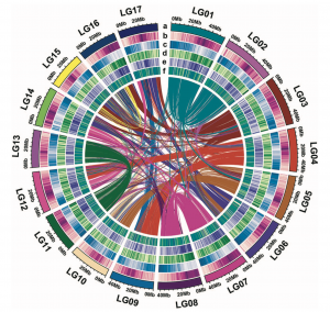 作者對(duì)野生枇杷(Eriobotrya japonica?Lindl.)(2n = 34)的基因組進(jìn)行了研究,與流式細(xì)胞儀預(yù)估的結(jié)果(~760Mb)相一致,k-mer分析結(jié)果顯示基因組大小為737.06 Mb。隨后,利用152.6 Gb的ONT數(shù)據(jù)(reads N50 = 31.6kb)進(jìn)行基因組組裝,同時(shí)利用二代數(shù)據(jù)糾錯(cuò)和Hi-C數(shù)據(jù)掛載,成功組裝了分布在17條染色體上的783.7 Mb的野生枇杷基因組序列(圖1);其中,scaffold N50和contig N50分別為41.8Mb和3.9Mb。二代轉(zhuǎn)錄組的回比率為98.7%,CEGMA和BUSCO評(píng)估分別為98.03%和98.27%,表明GZ-23基因組組裝的完整性較好(表1)。進(jìn)而結(jié)合從頭預(yù)測(cè)、同源比對(duì)預(yù)測(cè)和轉(zhuǎn)錄組輔助預(yù)測(cè),共預(yù)測(cè)到45,791個(gè)基因,鑒定到59.75%的基因組重復(fù)序列,此外,還鑒定出5381個(gè)rRNAs、765個(gè)tRNAs和129個(gè)miRNAs。