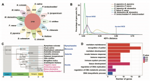 為研究野生枇杷基因組特征及進(jìn)化,作者將其與藍(lán)星睡蓮、水稻、鐵皮石斛、番茄,茶樹、獼猴桃、蘋果、白梨、野草莓、擬南芥,杧果和葡萄基因組進(jìn)行比較基因組分析,通過基因家族聚類,發(fā)現(xiàn)92%(42,150)的蛋白編碼基因聚為20,668個(gè)基因家族,其中523個(gè)基因家族為枇杷特有的單拷貝(圖2A),主要參生物學(xué)質(zhì)量調(diào)控、激素水平、定位、運(yùn)輸和生長(zhǎng)素極性運(yùn)輸?shù)壬镞^程。通過4DTv和Ks對(duì)全基因組復(fù)制事件分析表明,枇杷基因組中發(fā)生了兩次全基因組復(fù)制(WGD)事件,最近的WGD事件發(fā)生在30-45 Mya,而古WGD可能發(fā)生在已知的約120~130 Mya的古六倍化WGT(γ)事件。系統(tǒng)分化表明,枇杷與蘋果和梨擁有共同的祖先,這三個(gè)物種的分化發(fā)生在最近的一次WGD事件之后,通過比較分析,枇杷基因組104個(gè)基因家族發(fā)生擴(kuò)張,僅有一個(gè)基因家族發(fā)生收縮,GO富集分析表明,發(fā)生擴(kuò)張的基因家族主要參與花粉識(shí)別、分生組織發(fā)育與維持、免疫反應(yīng)、和DNA代謝過程的調(diào)節(jié)等生物過程;KEGG分析表明,主要參與半乳糖代謝、氨基酸代謝、氨基糖/核苷酸糖代謝、氮代謝、不飽和脂肪酸生物合成等通路。收縮的基因家族的生物學(xué)過程只參與了蛋白質(zhì)磷酸化。