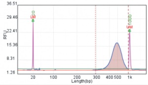 純化后的PCR產(chǎn)物,需要進(jìn)一步濃度和片段大小檢測。其中濃度能達(dá)到上機(jī)測序要求即可;片段大小必須滿足:片段范圍為300-700bp,主峰在450-550bp;無接頭片段和大片段污染。質(zhì)檢合格的產(chǎn)物可用于高通量測序。