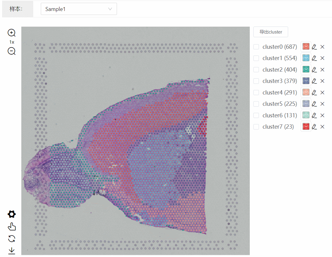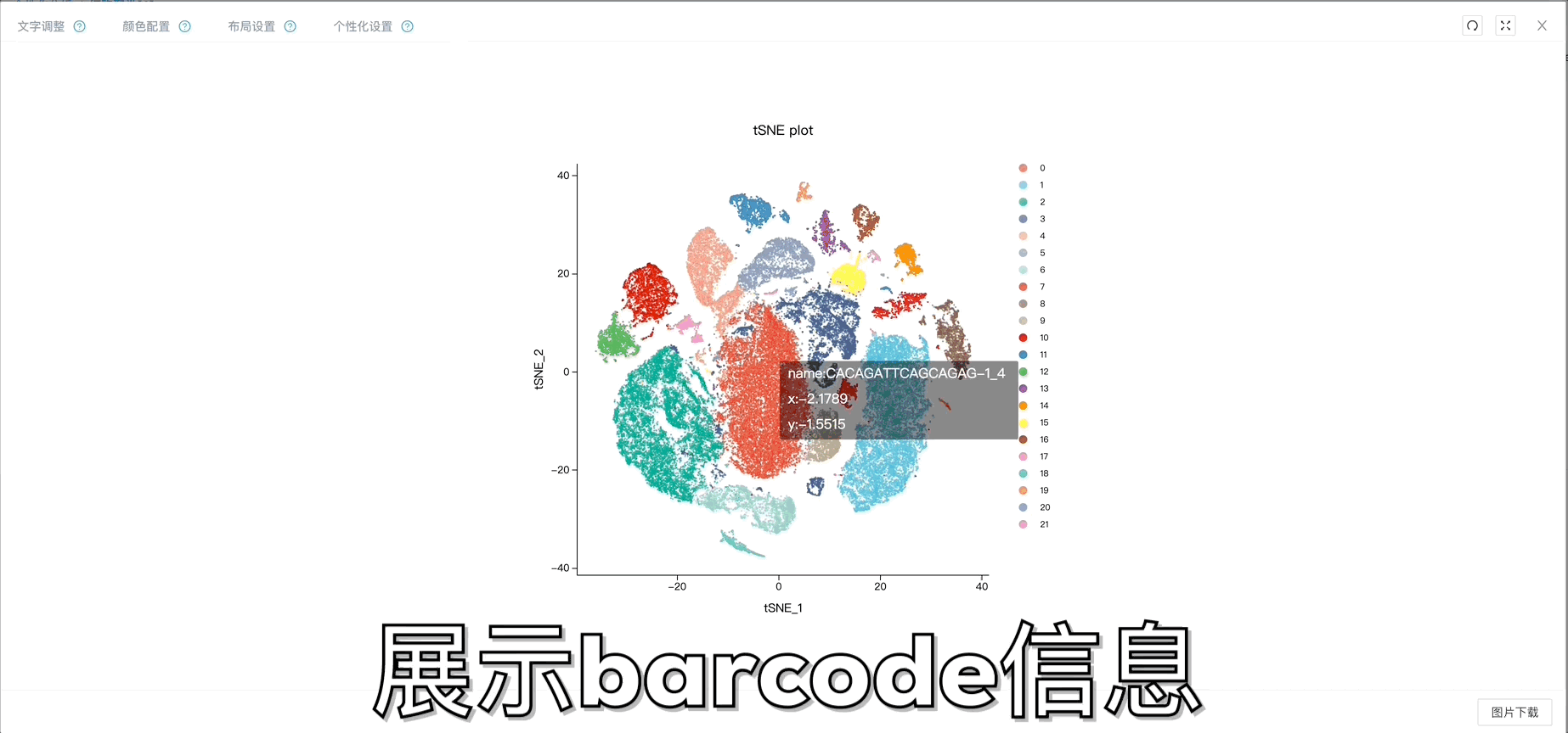 篩選到有效細(xì)胞后,可以基于細(xì)胞的基因表達(dá)矩陣,進(jìn)行細(xì)胞聚類分析。細(xì)胞聚類交互圖可展示UMAP/TSNE圖,調(diào)整點(diǎn)的大小,點(diǎn)配色,文字等交互圖樣式可自定義,具體見下圖及圖中的描述。