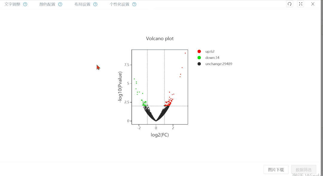 火山圖(Volcano Plot)可以快速地查看基因/物質(zhì)在兩個(組)樣品中表達(dá)水平的差異?;鹕綀D的交互式支持自定義展示一定數(shù)目的重點(diǎn)差異基因,還支持支持選擇重點(diǎn)差異基因進(jìn)行數(shù)據(jù)篩選,進(jìn)行二次數(shù)據(jù)處理。