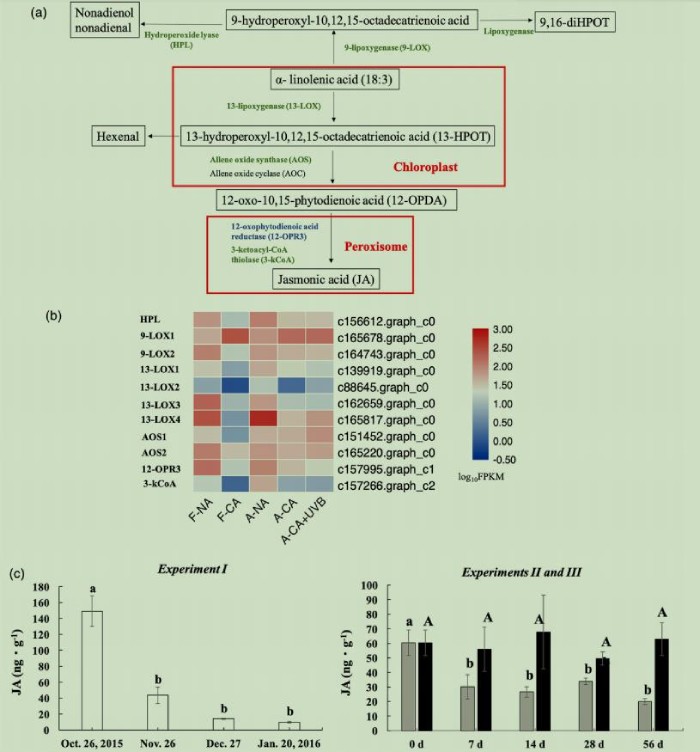 圖4(a)亞麻酸代謝——茉莉酸的生物合成途徑,(b)與這一途徑相關(guān)DEGs熱圖,(c)田間(試驗I)和人工(試驗II和III)低溫馴化過程中葉片組織JA含量的變化。