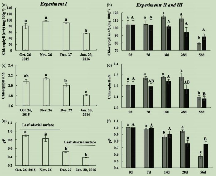 試驗I中葉綠素(a+b)含量從10月26日至1月20日(圖5a)降低了30%(圖5a),試驗II和III在0-56天處理后分別降低了23%和15%(圖5b)。這表明,隨著溫度的降低,葉片試圖通過降低葉綠素含量來降低光吸收。試驗I中,葉綠素a/b在10月26日至1月20日下降了15%(圖5c);試驗II和III中,從0-56天分別減少8%和6%(圖5d)。葉綠素a/b的變化表明試驗I反應(yīng)中心的降解比試驗II和III更嚴(yán)重。代表光系統(tǒng)II反應(yīng)中心開放度的光化學(xué)猝滅(qP)在10月26日至1月20日,降低了57%(圖5e),試驗II和III處理0~56天后,qP分別降低了43%和25%(圖5f)。葉綠素(a+b)、葉綠素a/b和qP在試驗I中下降得更多,說明光保護(hù)或光抑制作用更明顯。