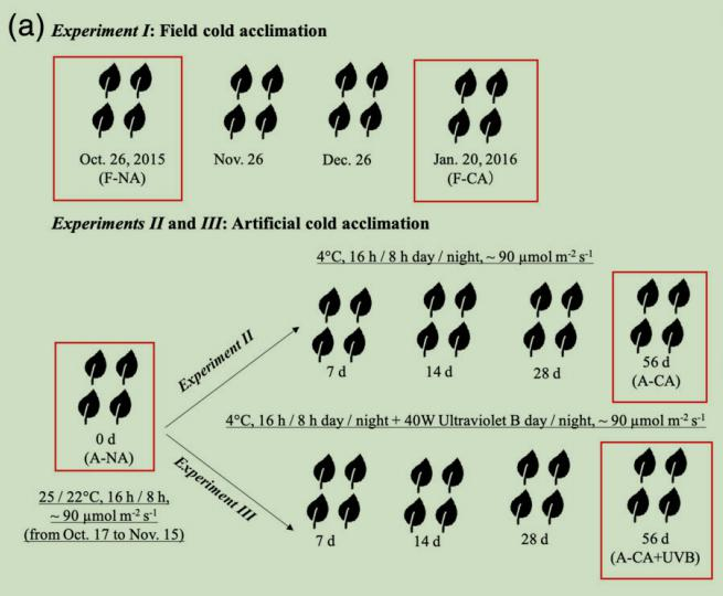 選3年生的“ElsieLee”杜鵑,用于田間或人工低溫馴化試驗,共3組試驗:ExperimentI田間低溫馴化(F-CA),ExperimentII人工低溫馴化(A-CA),ExperimentIII人工用紫外光B進(jìn)行低溫馴化(A-CA+UVB)。每組試驗36盆,分為3個生物學(xué)重復(fù),每個生物學(xué)重復(fù)12盆,采集當(dāng)年生長的完全展開的葉子進(jìn)行實驗,葉片在抽樣日期收集后立即在液氮中冷凍,然后-80℃保存。
