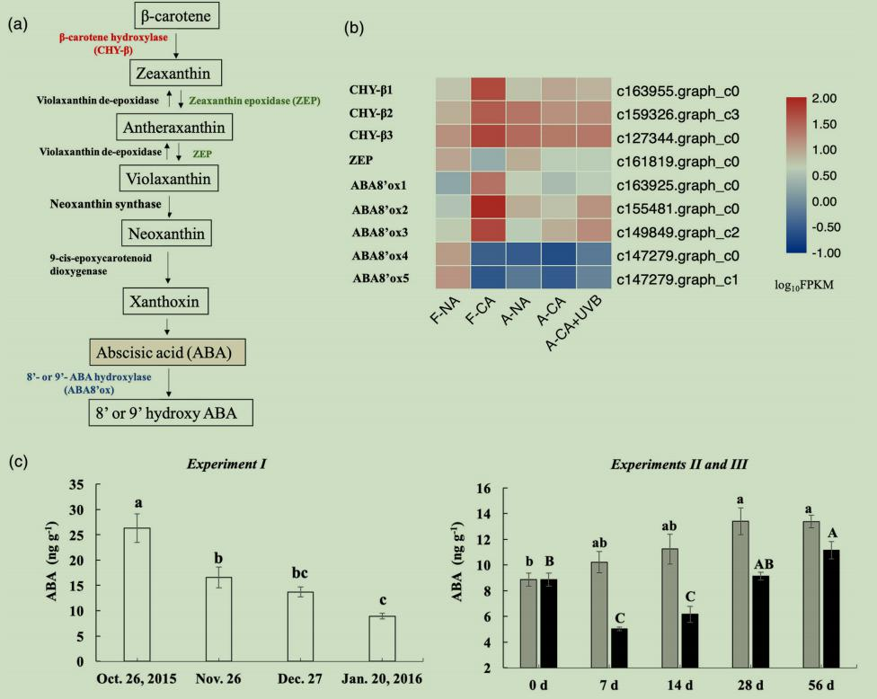 圖3(a)β-胡蘿卜素介導(dǎo)的脫落酸代謝途徑,(b)β-胡蘿卜素介導(dǎo)的脫落酸代謝途徑的DEGs熱圖,(c)田間(試驗I)和人工(試驗II和III)低溫馴化過程中葉片組織ABA含量的變化。