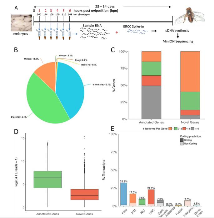 由于受精卵的興趣和令人費(fèi)解的性質(zhì),胚胎發(fā)育已在模型生物中廣泛研究。然而,在生物中沒(méi)有很好表征,長(zhǎng)讀長(zhǎng)RNA-seq有可能揭示迄今未知的基因,完善注釋信息,并擴(kuò)展亞型多樣性。作者匯集了混合性別橄欖果蠅(Bactroceraoleae)胚胎,這些胚胎在產(chǎn)卵的前6個(gè)小時(shí)后每小時(shí)收集一次。這些時(shí)期的研究很有意義,因?yàn)橹皩?duì)B.oleae的研究表明,在此期間開(kāi)始通過(guò)基因的可變剪接介導(dǎo)的性別決定機(jī)制。此外,來(lái)自地中海實(shí)蠅(Ceratitiscapitata)的證據(jù)表明,在此期間發(fā)生極細(xì)胞(原始生殖細(xì)胞)的建立,因此,在此期間闡明轉(zhuǎn)錄狀態(tài)非常重要。