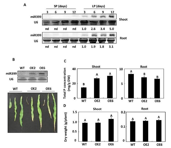圖1:MIR399b過表達(dá)轉(zhuǎn)化玉米在水培下的表型,A,smallRNAnorthernblot顯示在Pi缺乏的玉米根和地上部分的miR399是上調(diào)的;B,水培下的MIR399b過表達(dá)玉米的Pi中毒表型;C,Pi缺乏條件下,野生型和突變體玉米中根和地上部分的P濃度;D,Pi缺乏條件下,野生型和突變體的根和地上部分的干重。