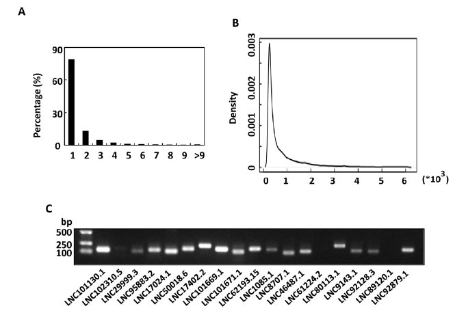 圖4:玉米lncRNAs的鑒定。A,每個(gè)lncRNA轉(zhuǎn)錄本的外顯子分布;B,lncRNA的外顯子長度密度分布;C,RT-PCR證實(shí)隨機(jī)選擇的lncRNA