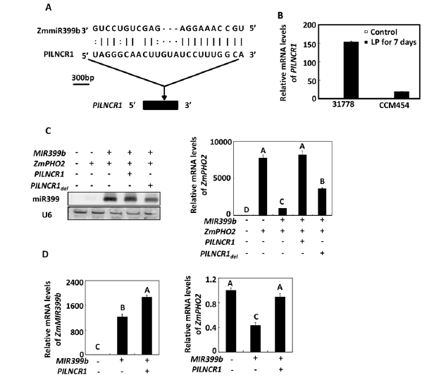 如圖5A,由于lncRNA819包含ZmmiRNAd的一段互補(bǔ)區(qū)域,所以它吸引了我們的注意力。使用3,和5,RACE,一個(gè)不包含內(nèi)含子的677bp的cDNA的序列被克隆出來。如圖5B,在磷高效玉米CCM454和磷低效玉米31778植株中,lncRNA819被磷缺乏誘導(dǎo)顯著表達(dá),因此我們將lncRNA819叫做PILNCR1。
