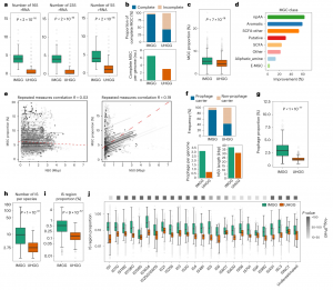 與UHGG數(shù)據(jù)庫相比,IMGG數(shù)據(jù)庫中前噬菌體基因組的分辨率有了很大提升。該方法在95%的IMGG中都能檢測(cè)到前噬菌體序列(與UHGG(55%)相比)。IMGG和UHGG每個(gè)基因組編碼前噬菌體的平均數(shù)量分別為4個(gè)和1個(gè)。IMGG中的前噬菌體序列的連續(xù)性也較高,N50長度為37974 bp(UHGG中為31064 bp;圖3f);IMGG中前噬菌體編碼區(qū)的基因組比例是UHGG的4.2倍(圖3g)。與UHGG相比,IMGG中的IS區(qū)域更加jing q,表現(xiàn)在在每個(gè)物種的IS區(qū)域總拷貝數(shù)(增加了三倍;圖3h)和IS編碼區(qū)域的基因組比例(增加了近四倍;圖3i)。IS類別中改善程度*高的是IS1380(與UHGG相比,改善了5.6倍),其次是IS5、IS1634和ISAS1(分別是5.5倍、5.5倍和5.3倍;圖3j)。
