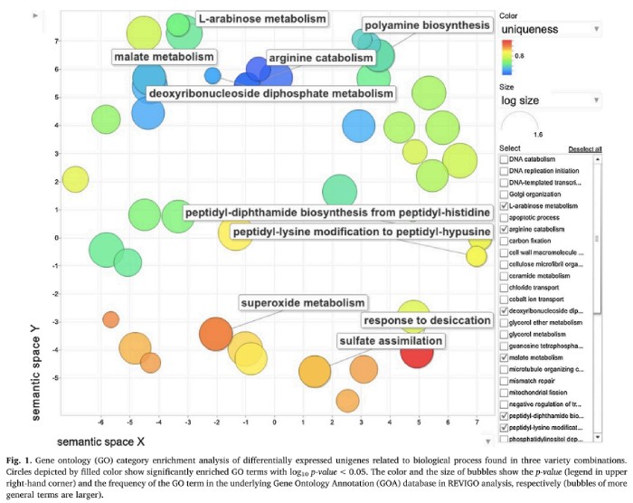 對(duì)差異表達(dá)的基因進(jìn)行 GO 富集分析。在生物過程類別中,主要與超氧化物酶代謝,精氨酸分解代謝,蘋果酸代謝和多胺生物合成有關(guān)。分子功能類別中的富集類別為硫氧還蛋白活性,固醇結(jié)合,L-蘇氨酸氨裂解酶活性和富馬酰乙酰乙酸酶活性。在細(xì)胞成分類別中,主要為高爾基體堆積,小亞基加工體,細(xì)胞外間隙和 1,3-β-D-葡聚糖合酶復(fù)合體。