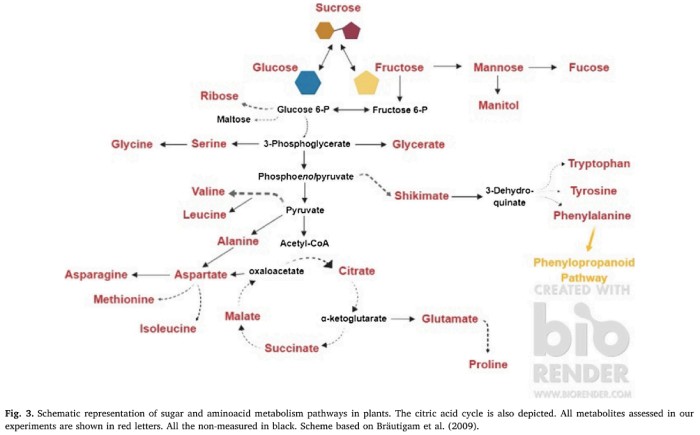 采集“Katerini 53”,“Xanthi 81”和“Smirrni 3B”葉片樣品,并使用氣相色譜GC-MS 和 LC-MS / MS 方法進(jìn)行代謝分析。基因型預(yù)先鑒定為不同的色譜模式,共有 78 種代謝化合物(包括糖,氨基酸,有機(jī)酸)差異積累,如圖 3 所示。詳細(xì)的非靶向 GC-MS 代謝組學(xué)分析用于鑒定煙葉中產(chǎn)生的大多數(shù)主要代謝產(chǎn)物。在本研究中,所測(cè)得的最豐富的可溶性糖是果糖,葡萄糖,半乳糖和蔗糖。在果糖和蔗糖中檢測(cè)到統(tǒng)計(jì)學(xué)差異;“Katerini 53”中的果糖含量更高,而“Smierni 3B”中的蔗糖含量更高?!癒aterini 53”與其它兩個(gè)品種相比葡萄糖和半乳糖水平較高,差異無統(tǒng)計(jì)學(xué)意義。在可溶性醇中,兩個(gè)豐富的代謝產(chǎn)物是山梨糖醇和肌醇,但在品種之間未檢測(cè)到統(tǒng)計(jì)學(xué)上的顯著差異。這三個(gè)品種中的蘋果酸含量沒有任何統(tǒng)計(jì)上顯著不同?!癤anthi 81”葉子的氨基酸含量最高,但谷氨酸和 γ-氨基丁酸(GABA)除外。GABA 和脯氨酸是煙葉中的主要氨基酸。與其他兩個(gè)品種相比,“Smirrni 3B”中的 GABA 水平明顯更高。’Smirrni 3B’和’Xanthi 81’中的脯氨酸水平較高,而“Katerini 53”的脯氨酸水平最低。在“Smirrni 3B”中檢測(cè)到了高濃度的甘氨酸和絲氨酸這兩種必需氨基酸。煙草生物堿在根部合成,然后轉(zhuǎn)運(yùn)到葉片。生物堿、尼古丁與植物抗草食動(dòng)物防御有關(guān)。在三個(gè)品種中檢測(cè)到的尼古丁濃度在統(tǒng)計(jì)學(xué)上有顯著差異。結(jié)果表明,“Xanthi 81”的尼古丁濃度最高,而“Smirrni 3B”的尼古丁濃度最低。與“Katerini 53”相比,“Xanthi 81”中腐胺的含量有所降低,但其濃度仍高于“Smirrni 3B”。鑒定了所有擬參與煙草中尼古丁生物合成的相應(yīng)基因,但僅發(fā)現(xiàn)少數(shù)幾個(gè)在成熟葉片中表達(dá)。然而,基因 XS 和 QPT(三分之二)在“Xanthi 81”中表達(dá)較高。與其它兩個(gè)品種相比,這與“Xanthi 81”葉片中較高的尼古丁含量相關(guān),這表明它可能是遺傳控制的。