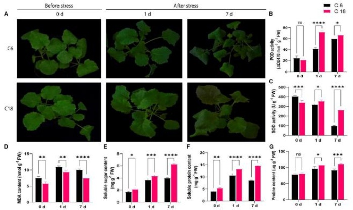 耐寒(C18)和冷敏感(C6)油菜品種在 0 d (CK)、脅迫 1d 和 7d 對冷脅迫(4℃)的生理指標(biāo)