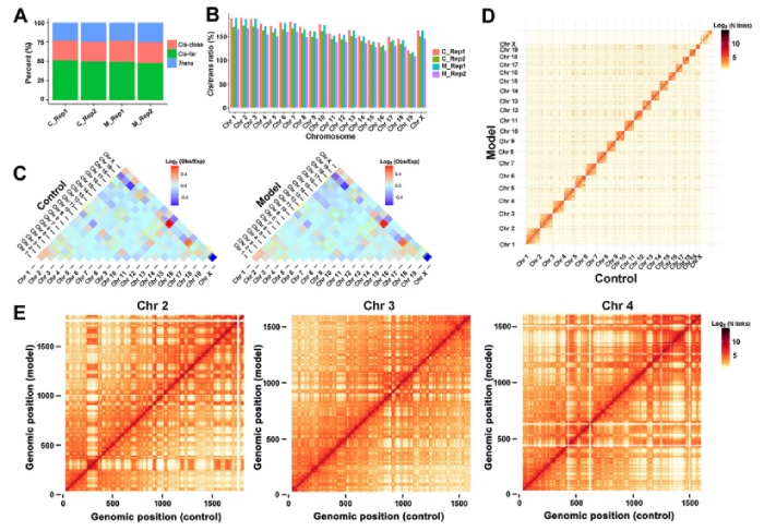 為了獲得三維染色質(zhì)構(gòu)象圖,作者對(duì)肝臟樣本的Hi-C文庫(kù)進(jìn)行了測(cè)序,每組總共獲得超過(guò)477 Gb的數(shù)據(jù)。在去除PCR重復(fù)位點(diǎn)后,每個(gè)樣本獲得了超過(guò)8.02億對(duì)有效Hi-C數(shù)據(jù),測(cè)序深度為68.56%和68.96%,能夠以10 kb分辨率檢查C組和M組的相互作用。順?lè)词较嗷プ饔玫谋壤@示,約四分之三的相互作用發(fā)生在染色體內(nèi),四分之一的相互作用發(fā)生在染色體間質(zhì)(圖2A)。,這個(gè)頻率可以揭示染色體在基因組中的相互作用強(qiáng)度和染色體在細(xì)胞核中的相對(duì)位置。染色體之間的相互作用頻率熱圖如圖2C所示。通過(guò)熱圖顏色由對(duì)照組的藍(lán)色變?yōu)镹AFLD組的淺紅色,可以發(fā)現(xiàn)染色體Chr2與Chr5之間相互作用頻率的差異,提示NAFLD組兩染色體之間距離較近,相互作用較強(qiáng)。相比之下,觀察到的顏色從紅色變?yōu)樗{(lán)色,表明NAFLD組染色體之間的空間距離更遠(yuǎn),相互作用更弱,如Chr 7和Chr 11之間的相互作用。將各組的兩個(gè)Hi-C庫(kù)結(jié)合起來(lái),進(jìn)行對(duì)照組與模型組的對(duì)比分析。根據(jù)任意兩個(gè)bin之間覆蓋的Hi-C讀對(duì)的歸一化相互作用信號(hào)強(qiáng)度,繪制全基因組相互作用矩陣(圖2D),染色體內(nèi)相互作用矩陣如圖所示。