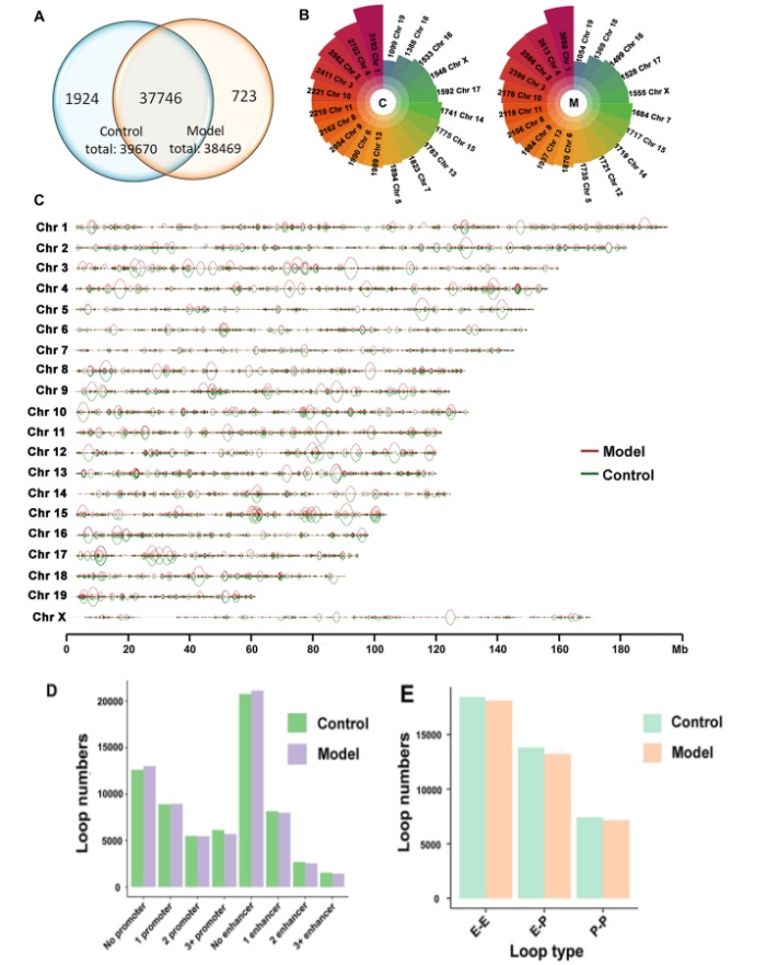 除了短程染色質(zhì)相互作用外,3D基因組組織中的遠(yuǎn)程環(huán)帶來(lái)了兩個(gè)線性分離的位點(diǎn)之間的物理接近。作者通過(guò)Hi-C接觸矩陣使用改進(jìn)的HICCUP方法注釋染色質(zhì)環(huán),分辨率為10 kb。結(jié)果顯示,與NAFLD發(fā)展相關(guān)的環(huán)的總數(shù)減少(從39,670到38,469,圖5A),而環(huán)的大小沒(méi)有變化(環(huán)的中位數(shù)長(zhǎng)度為70 kb,支持信息圖S6A。每條染色體的環(huán)分布如圖5B和C所示,Chr 1上的環(huán)分布*多,對(duì)照組和模型組分別有3193個(gè)和3099個(gè)環(huán)(圖5B)。