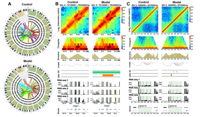 非酒精性脂肪性肝病(NAFLD)的3D基因組和基因組變異在很大程度上是未知的,盡管它們?cè)诩?xì)胞功能和生理過(guò)程中起著關(guān)鍵作用。在正常和NAFLD小鼠的肝臟上進(jìn)行高通量染色體構(gòu)象捕獲(Hi-C)、ONT測(cè)序和rna測(cè)序(RNA-seq)測(cè)定。生成高分辨率3D染色質(zhì)相互作用圖,通過(guò)Hi-C檢測(cè)不同的3D基因組層次結(jié)構(gòu),包括A/B區(qū)室、拓?fù)湎嚓P(guān)結(jié)構(gòu)域(TADs)和染色質(zhì)環(huán),并檢測(cè)結(jié)構(gòu)變異(SVs)和拷貝數(shù)變異(CNVs)的全基因組測(cè)序。在正常和NAFLD小鼠間,發(fā)現(xiàn)了基因組中數(shù)千個(gè)區(qū)域在3D染色質(zhì)組織和基因組重排方面的變化,并揭示了基因調(diào)節(jié)異常經(jīng)常伴隨這些變化。在NAFLD中發(fā)現(xiàn)了候選靶基因,受基因重排和空間組織破壞的影響。作者的數(shù)據(jù)為NAFLD研究提供了高分辨率的三維基因組相互作用資源,揭示了遺傳重排、空間組織破壞和基因調(diào)控之間的關(guān)系,并確定了與NAFLD發(fā)病機(jī)制中這些變異相關(guān)的候選基因。這些新發(fā)現(xiàn)為NAFLD的發(fā)病機(jī)制提供了新的見(jiàn)解,并為NAFLD的治療提供了新的概念框架。