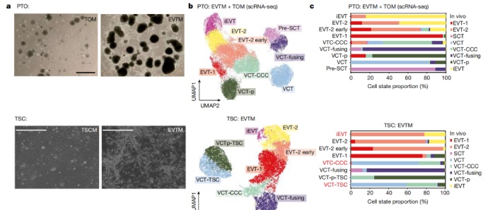 接下來,作者探討了在VCT到EVT分化過程中觸發(fā)的細(xì)胞內(nèi)在調(diào)控程序是否存在于源自兩種自我更新的初級滋養(yǎng)層類器官(PTO)和滋養(yǎng)層干細(xì)胞(TSC)產(chǎn)生的EVTs中。通過對以下樣本進(jìn)行了scRNA-seq:(1)實驗組:在EVTM培養(yǎng)基中分化的PTO(PTO-EVTM), 對照組:在滋養(yǎng)層培養(yǎng)基(TOM)中生長的PTO(PTO-TOM);(2)在EVTM培養(yǎng)基中分化的TSC(TSC-EVTM),對照組:在滋養(yǎng)層干細(xì)胞培養(yǎng)基中生長的TSCs(TSC-TSCM)。發(fā)現(xiàn):