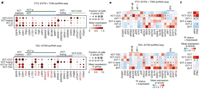 a.PTOs比TSCs更好地體現(xiàn)VCT的異質(zhì)性。b.在PTOs中存在體內(nèi)定義的四個VCT亞群,,它們表達(dá)相同的典型標(biāo)志物。c.在PTO中,VCT-CCC在EVTM存在下富集,觸發(fā) FOXM1–NOTCH1 軸 NF-κB (NFKB2和BACH2)和AP-1調(diào)制器(JDP2和ATF3),相比之下,在TSC中找不到真正的VCT。D.在TSC和PTO中,VCT-CCC(CDH5,ITGB6和LCAT1)在EVTM培養(yǎng)基存在下富集,從而觸發(fā)NOTCH–FOXM1軸,導(dǎo)致 IRF6 進(jìn)一步下調(diào)和 EVT-1 中的 TP6323。