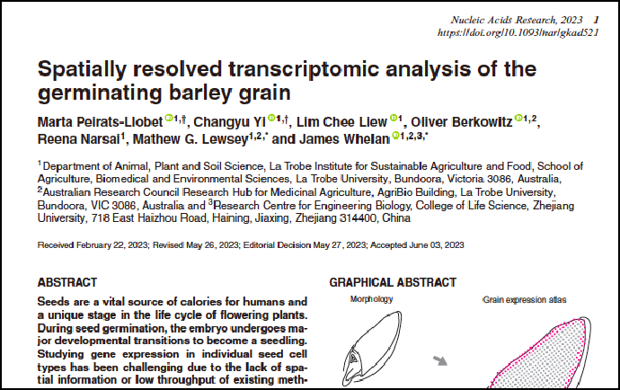 研究開發(fā)了大麥種子萌發(fā)過程的空間轉(zhuǎn)錄組學(xué)流程,通過進(jìn)行高通量的空間基因表達(dá)分析,揭示了不同功能基因類別在亞組織水平上的特定空間表達(dá)模式,為大麥萌發(fā)提供了空間解析細(xì)胞圖,并確定了特定的功能基因組目標(biāo),以更好地理解萌發(fā)過程中的細(xì)胞限制過程。