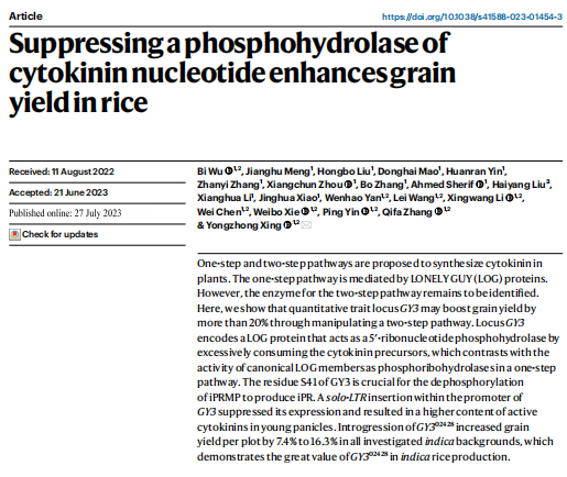 作者通過秈稻品種特青和粳稻品種02428構建高級遺傳群體克隆了產量相關基因GY3,其啟動子區(qū)域的反轉座子插入增強了啟動子區(qū)域的表觀修飾,降低GY3表達量,從而減少細胞分裂素合成前體底物的無效消耗,提高體內活性的細胞分裂素含量,增加每穗粒數和谷物產量。GY3可作為后期秈稻高產育種的重要目標基因,推動產量提升。