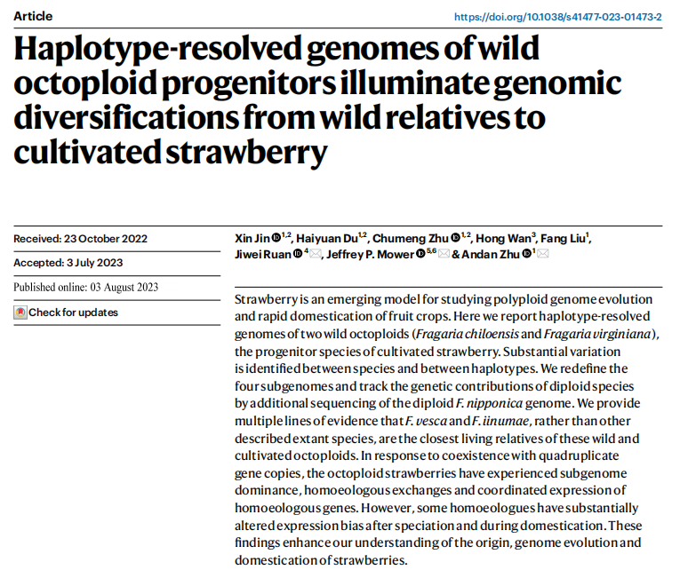 該研究報道了兩個八倍體野生草莓智利草莓 (F. chiloensis)和弗州草莓 (F. virginiana)染色體水平的高質量分型基因組組裝。探討了八倍體草莓在馴化過程中的同源偏向性表達分化,并鑒定到了一些重要的轉錄因子在馴化過程中發(fā)生了表達轉變。此研究深度解析了草莓的起源、基因組進化和馴化。(百邁客參與測序工作·)