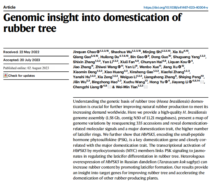 作者利用PacBio CLR+BioNano+Hi-C的方法構建了橡膠樹參考基因組,結合127個栽培和208個野生品種重測序數據對其馴化的分子機制解析,同時通過208份橡膠樹種質材料進行GWAS分析,鑒定到一個調控乳管數量的馴化基因。此研究將為后期橡膠樹的高產育種提供了分子基礎。