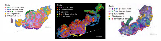 番茄是一種全球重要的經(jīng)濟作物,但在其愈傷組織中芽再生的分子機制仍有很多未知。為了深入研究番茄愈傷組織中芽再生的細胞發(fā)育和分子機制,研究團隊通過協(xié)作開發(fā)和掌握多種空間轉(zhuǎn)錄組實驗和分析技術(shù),建立了番茄愈傷組織芽再生的空間轉(zhuǎn)錄組圖譜。研究結(jié)果揭示了愈傷組織中存在高度異質(zhì)的細胞群,將番茄愈傷組織分為了表皮、維管組織、芽原基、成熟芽和內(nèi)部愈傷組織五種細胞類型。在表皮細胞中,研究發(fā)現(xiàn)了兩種主要的細胞亞型,它們分布在靠近空氣和培養(yǎng)基的不同位置,并具有不同的功能。