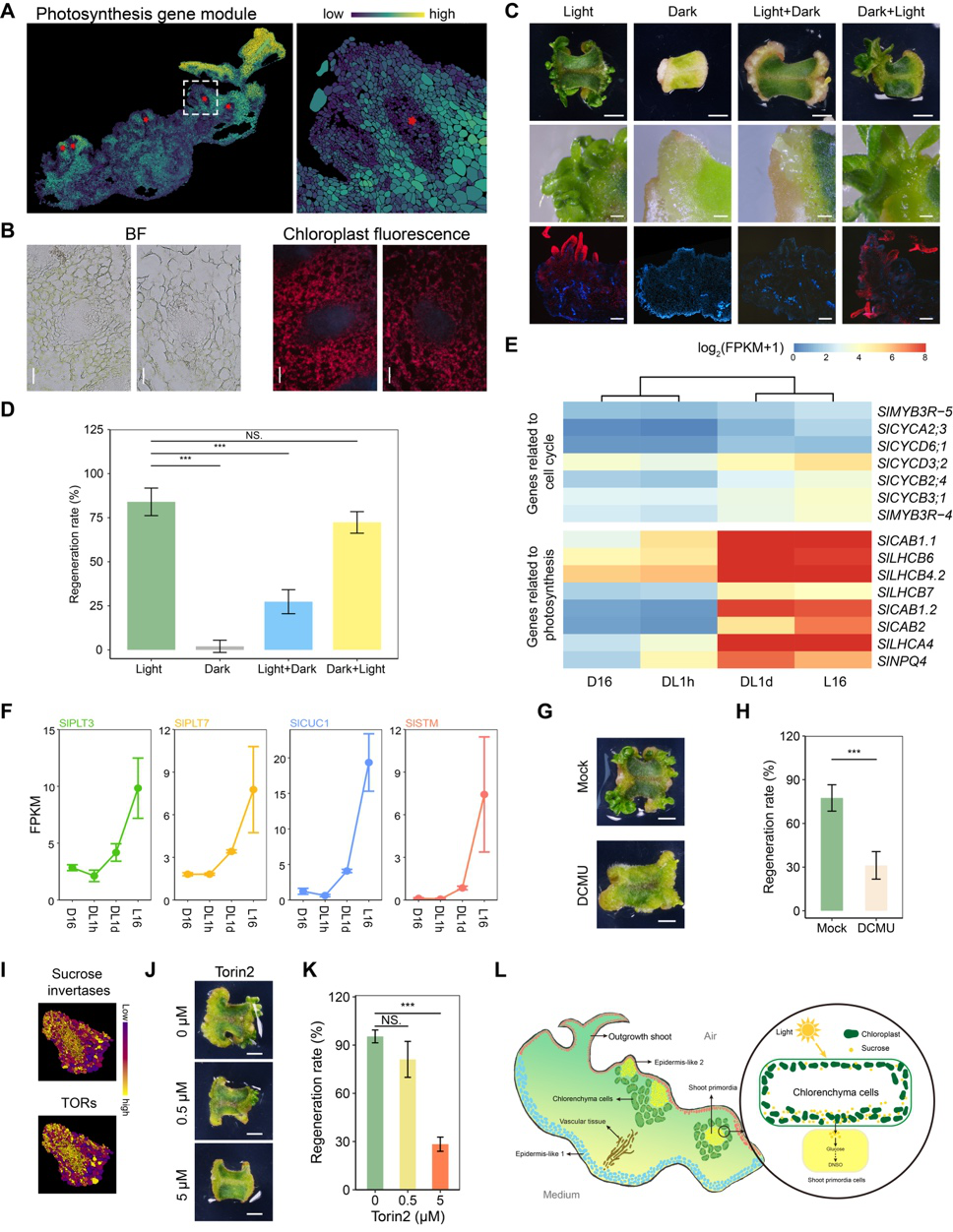 空間轉(zhuǎn)錄組技術(shù)優(yōu)勢在于揭示不同細胞位置關(guān)系。研究團隊發(fā)現(xiàn)番茄愈傷組織的芽原基被表達光合基因的細胞包圍,相鄰細胞含葉綠體,稱為綠色組織(chlorenchyma)細胞。黑暗后見光處理影響芽原基分化,光誘導(dǎo)綠色組織細胞對芽再生十分關(guān)鍵。光形態(tài)建成相關(guān)基因在芽原基和綠色細胞中卻無特定表達模式。光合抑制劑DCMU減慢芽再生速率,證明綠色細胞光合必要性。蔗糖可通過TOR信號調(diào)控芽原基發(fā)育,相關(guān)基因在芽原基位置高表達,綠色組織細胞蔗糖可傳輸至芽原基并激活TOR,促進芽的分化發(fā)育。