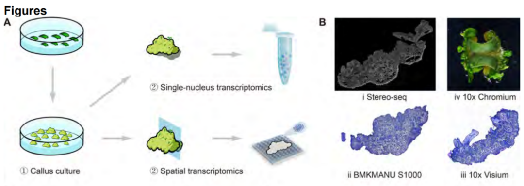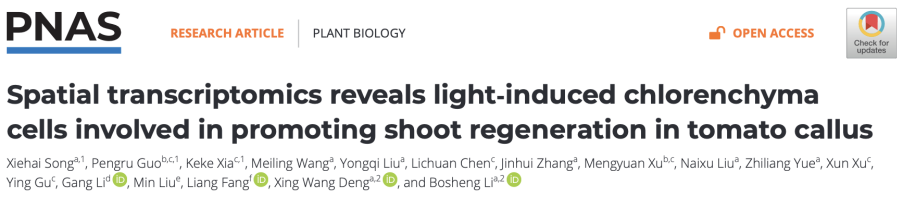 近日,北京大學(xué)現(xiàn)代農(nóng)業(yè)研究院的李博生研究員團隊與鄧興旺院士團隊在國際學(xué)術(shù)期刊PNAS上發(fā)表了題為“Spatial transcriptomics reveals light-induced chlorenchyma cells involved in promoting shoot regeneration in tomato callus”的研究論文,建立了植物愈傷組織芽再生的空間轉(zhuǎn)錄組圖譜。該研究利用了百創(chuàng)智造 BMKMANU S1000,華大BGI Stereo-seq,美國10x Visium三種空間轉(zhuǎn)錄組技術(shù)以及10X Chromium單細胞核轉(zhuǎn)錄組技術(shù),揭示了番茄愈傷組織內(nèi)部細胞的異質(zhì)性,并在單細胞水平上詳細解析了激素信號和重要調(diào)控因子在各種細胞和組織中的表達情況。研究結(jié)果不僅發(fā)現(xiàn)了表皮和芽原基細胞的亞型和功能,還揭示了綠色組織(chlorenchyma)細胞在芽原基細胞位置和分化發(fā)展中的重要作用,以及光照如何通過促進綠色組織細胞的發(fā)育和激活雷帕霉素靶蛋白TOR來推動芽再生過程。