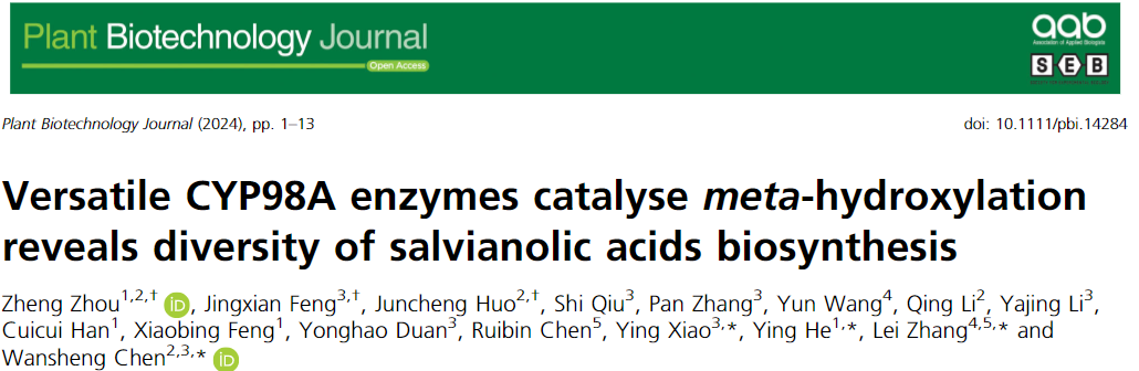 2024年1月16日,海軍軍醫(yī)大學(xué)陳萬(wàn)生與張磊團(tuán)隊(duì)合作在植物學(xué)領(lǐng)域國(guó)際一流學(xué)術(shù)期刊《植物生物技術(shù)》Plant Biotechnology Journal發(fā)表一項(xiàng)最新研究成果,題為:Versatile CYP98A enzymes catalyse meta-hydroxylation reveals diversity of salvianolic acids biosynthesis。本研究以富含丹酚酸的代表性重要藥用植物丹參為研究對(duì)象,闡明了丹酚酸生物合成的多樣性,為CYP98A酶在間位羥基化反應(yīng)中催化特異性的通用性提供了新的見(jiàn)解,同時(shí)也證明CYP98A酶是利用代謝工程策略提高丹酚酸含量的理想操作靶點(diǎn)。中藥丹參為唇形科鼠尾草屬植物丹參(Salvia miltiorrhiza Bge.)的干燥根和根莖,是我國(guó)常用中藥。丹參藥用歷史悠久,始載于中國(guó)傳統(tǒng)醫(yī)藥學(xué)典籍《神農(nóng)本草經(jīng)》,具有祛疲止痛、活血通經(jīng)、清心除煩之功效。丹參作為復(fù)方丹參滴丸、復(fù)方丹參片、丹紅注射液等藥物的原料,廣泛應(yīng)用于心、腦血管疾病的治療,丹參藥材的年使用量超萬(wàn)噸,屬于大宗常用中藥材。丹參有效成分主要包括脂溶性的丹參酮類化合物和水溶性的丹酚酸類化合物。