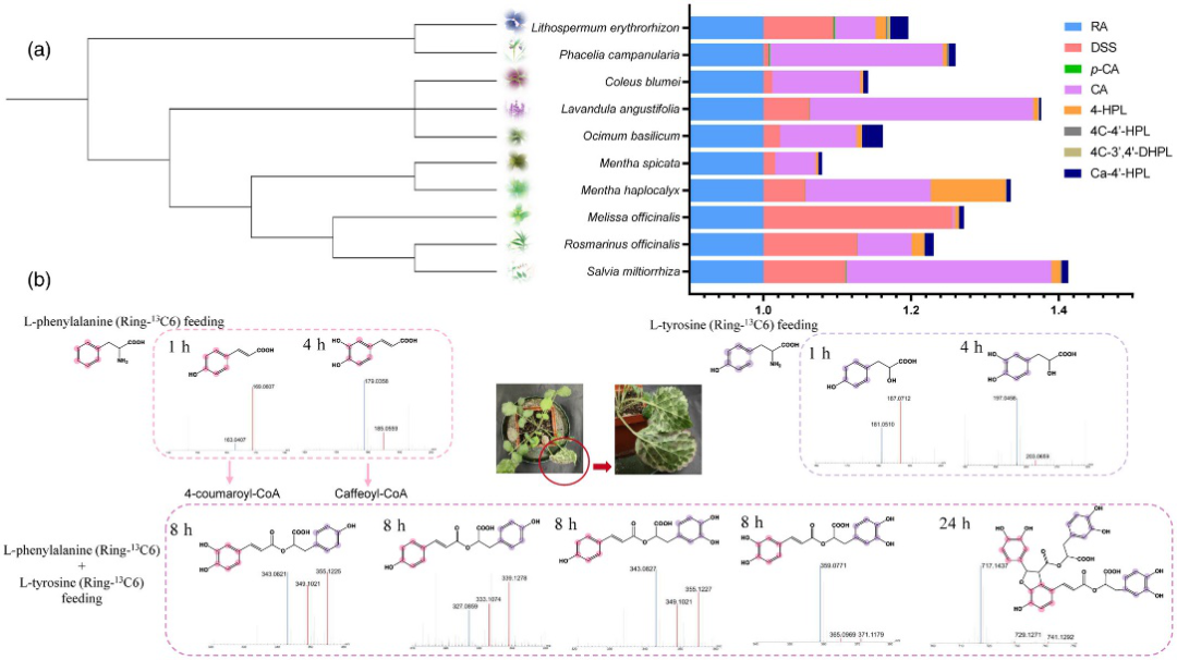 丹參中酪氨酸衍生的途徑從未被報(bào)道過(guò),丹參素(DSS)是否參與SA生物合成仍然未知。SA的生物合成可能是多樣化的,作者在同位素標(biāo)記的喂養(yǎng)實(shí)驗(yàn)去驗(yàn)證這一結(jié)論。含有同位素標(biāo)記的 L-苯丙氨酸和 L-酪氨酸浸潤(rùn)3個(gè)月大的丹參葉子中。從不同時(shí)間點(diǎn)收集的葉片中提取SA,并使用UPLC-Q-TOF/MS進(jìn)行分析。結(jié)果顯示,在p-CA、CA、4-HPL、DSS、SAB和RA及其前體(包括4C-4′-HPL、4C-3′、4′-DHPL和Ca-4′-HPL)均被檢測(cè)出標(biāo)記(圖1b)。這些結(jié)果驗(yàn)證了作者的推測(cè),即不同的?;w,包括4C-CoA和CA-CoA以及含有4-HPL和DSS的?;荏w參與SA的形成。SA的生物合成途徑是多種多樣的。