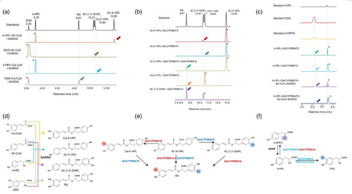 上述研究表明SmCYP98A75負(fù)責(zé)RA生物合成中?;荏w部分的 C-3′羥基化,因此作者推測(cè)SmCYP98A 酶可能在丹參素DSS形成中發(fā)揮重要作用。體外酶活實(shí)驗(yàn)表明,當(dāng)SmCYP98A75或SmCYP98A14與4-HPL一起孵育時(shí),在產(chǎn)物中檢測(cè)到4-HPPA,說(shuō)明這兩種酶表現(xiàn)出將4-HPL的側(cè)鏈羥基直接氧化為酮的能力。然而,在兩個(gè)反應(yīng)系統(tǒng)中均未檢測(cè)到DSS。作者認(rèn)為植物內(nèi)部生物合成環(huán)境是復(fù)雜的,包括許多代謝途徑和催化酶,在反應(yīng)體系中加入?;w和SmRAS,以模擬丹參的DSS生物合成。與SmRAS和4C-CoA或Ca-CoA孵育后,僅在SmCYP98A75催化的反應(yīng)中產(chǎn)生DSS(圖3c,f)。