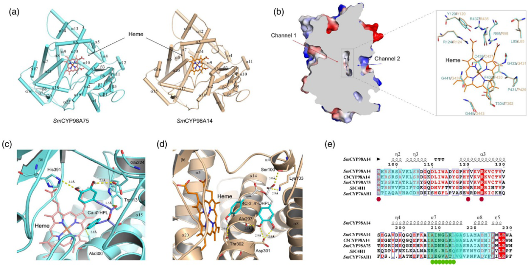 SmCYP98A75和SmCYP9814底物特異性的差異為研究底物識(shí)別和代謝的結(jié)構(gòu)特征提供了機(jī)會(huì)。使用在線SWISS-MODEL進(jìn)行同源建模。SmCYP98A75和SmCYP98A14的整體結(jié)構(gòu)模型高度相似,表明兩種SmCYP98A的底物識(shí)別和代謝是保守的。SmCYP98A75的整體結(jié)構(gòu)模型包含22個(gè)α螺旋和8個(gè)β鏈,SmCYP98A14的整體結(jié)構(gòu)模型包含20個(gè)α螺旋和6個(gè)β鏈,與 SmCYP98A14 高度相似(圖5a)。在結(jié)構(gòu)模型中觀察到血紅素分子與兩個(gè) SmCYP98A 的活性結(jié)合口袋。通過(guò)與口袋內(nèi)殘基的多次相互作用,它被穩(wěn)定在正確的位置。兩種SmCYP98A和CbCYP98A14的血紅素包圍基序和關(guān)鍵催化氨基酸是高度保守的(圖5b)?;谂c已知 P450 的疊加,通道 1 可能容納底物進(jìn)入和產(chǎn)物,而通道 2 可能使血紅素能夠進(jìn)入水和質(zhì)子。