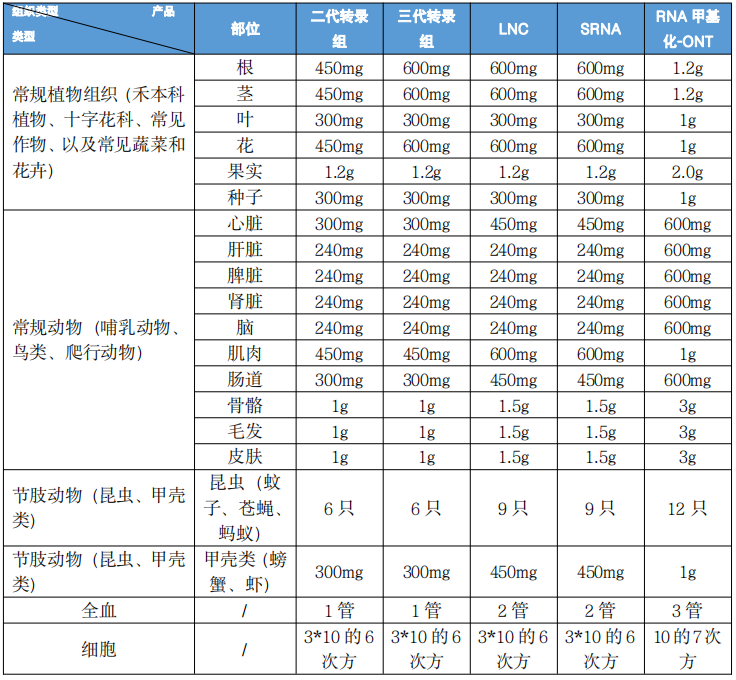 2) 組織送樣量:建議送樣量適用于 95%的物種組織,少部分組織因胞內(nèi)核酸量較低,需適當(dāng)增加送樣量,比如動(dòng)物皮膚、毛發(fā),植物果實(shí)、根等。請嚴(yán)格按照上方組織送樣量要求送樣,送樣量過少或過多均不利于提取實(shí)驗(yàn)。采樣量較少會導(dǎo)致提取的 RNA 總量、濃度不合格,采樣量過多反而會造成速凍不徹底、提取取樣困難、凍融降解等危險(xiǎn)。